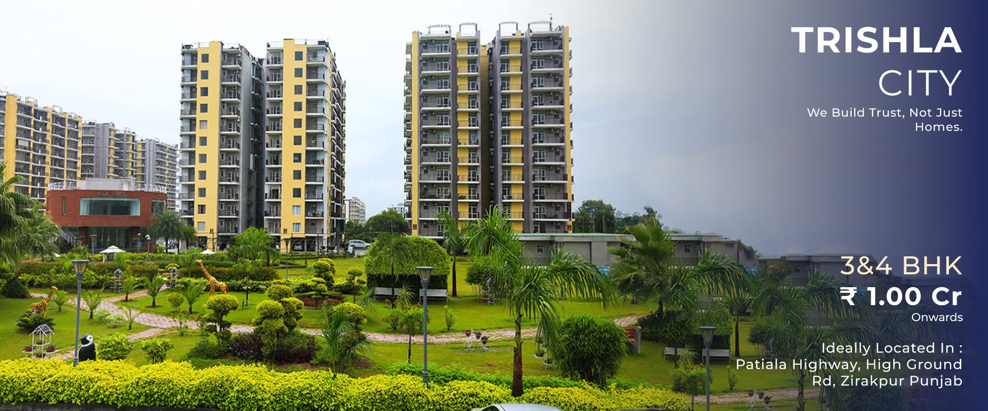 Trishla City residential township nestled in pollution and congestion free region of Zirakpur. It is a premium residential development that offers a range of 2 bhk flats, 3 bhk flats, 4 bhk flats surrounded by lush green landscapes with the serenity of the nature & the convenience of city life.