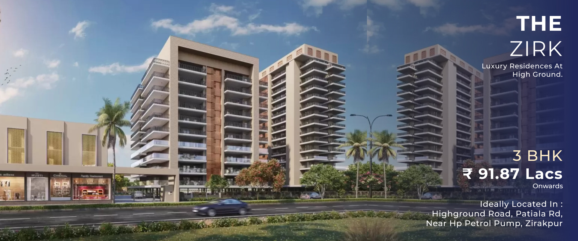 The Zirk residential apartments located on the prime locality of zirakpur that connected with a pallaned connectivity to Chandigarh Airport and and IT city mohali. The zirk as name explained the location comprises of exiting residential area with a secure airforce area in the vicinity to provide a privilige for one who is residing in the locality. With a luxury gated group housing society Zirk will provides an exceptional experience to one who think to have a pacefull area just at 5 to 10 min drive away from the daily life style requirements either School, Daily needs Shops, Malls, Food Courts, Open Retial complexes, IT comanies, banking,job locations etc.
